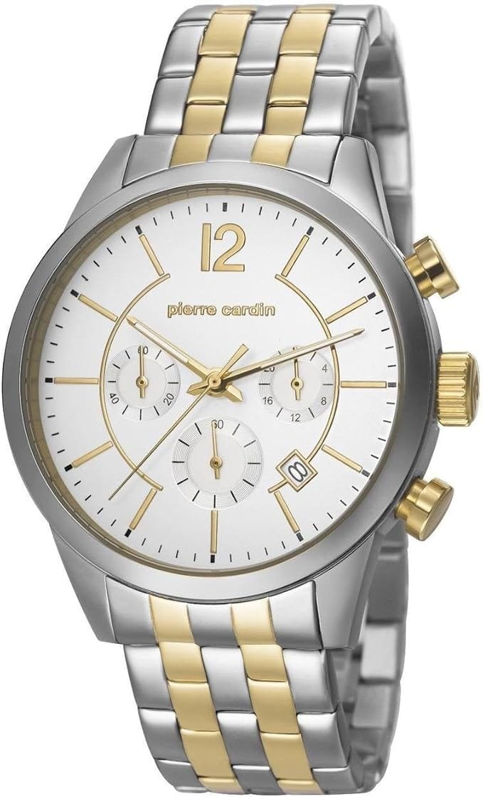 ساعة بيير كاردان للرجال – مينا اللون ابيض – عدادات كرنوجراف – سوار معدني فضي وذهبي – PC106591F09